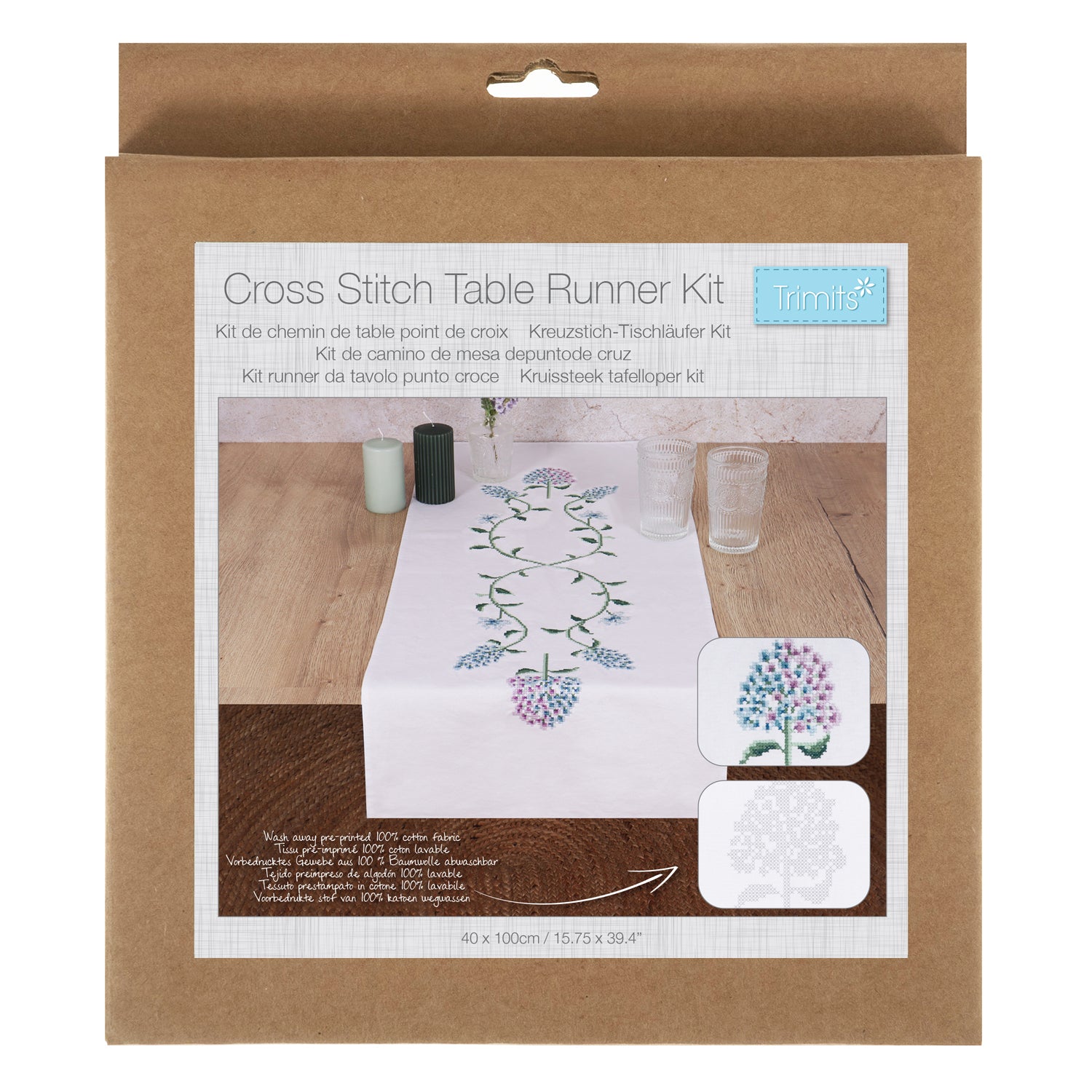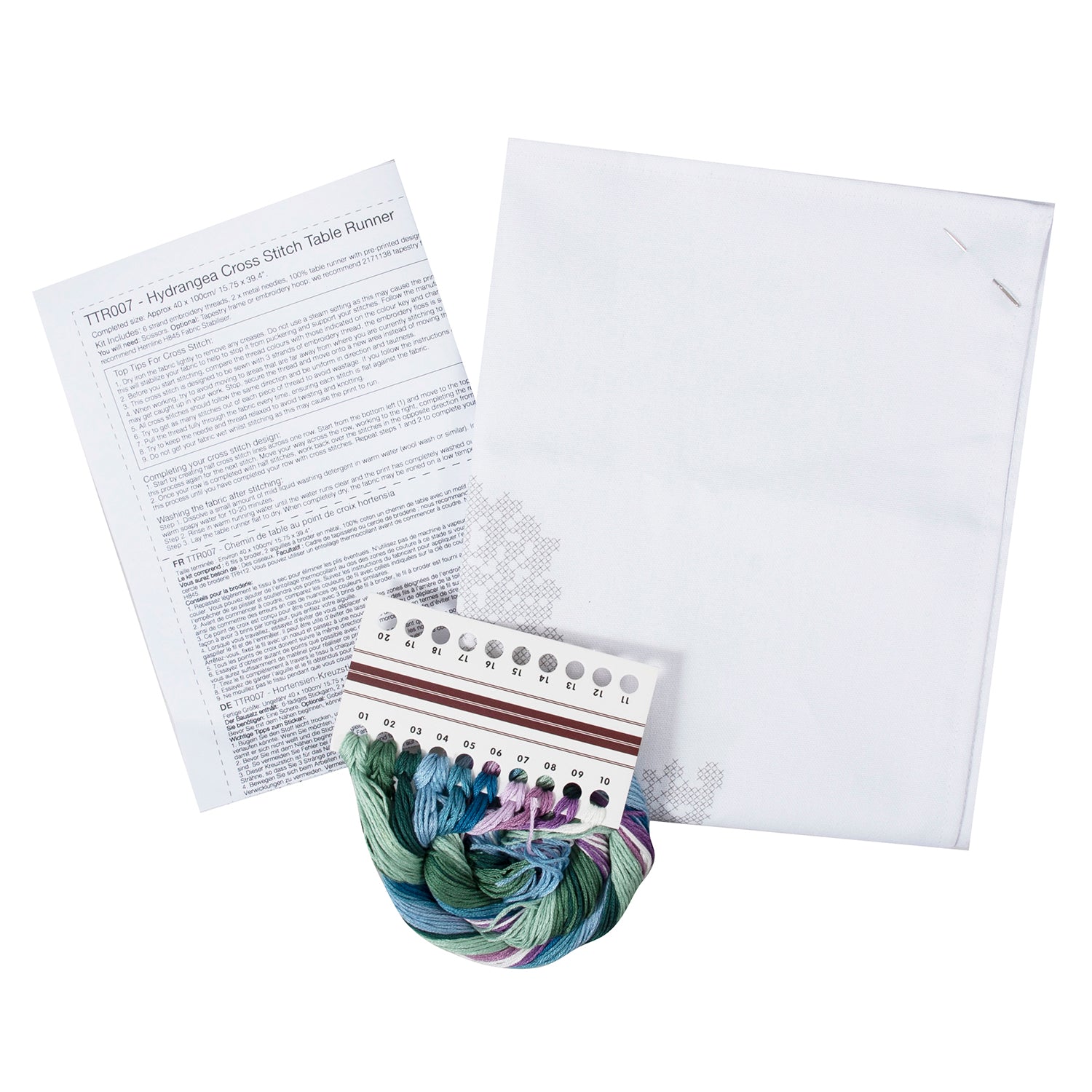 - Kit includes: 6 stranded embroidery threads; needle; pre-printed table runner and instructions in 6 languages (EN/FR/DE/ES/IT/NL).